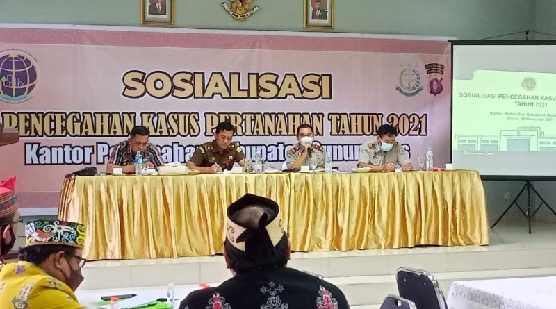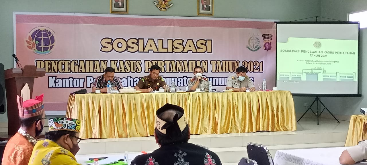 KUALA KURUN, VOICEBORNEO.COM – Pada Selasa(2/11/2021) lalu, Kantor Pertanahan (Kantah) Kabupaten Gunung Mas (Gumas) melaksanakan sosialisasi pencegahan kasus pertanahan. Yang mana, merupakan kegiatan berjenjang yang dimulai dari Direktorat Jenderal Penanganan Sengketa dan Konflik Pertanahan, lalu dilaksanakan oleh Kantor Wilayah (Kanwil) Kantah Provinsi Kalteng, termasuk kabupaten dan kota.