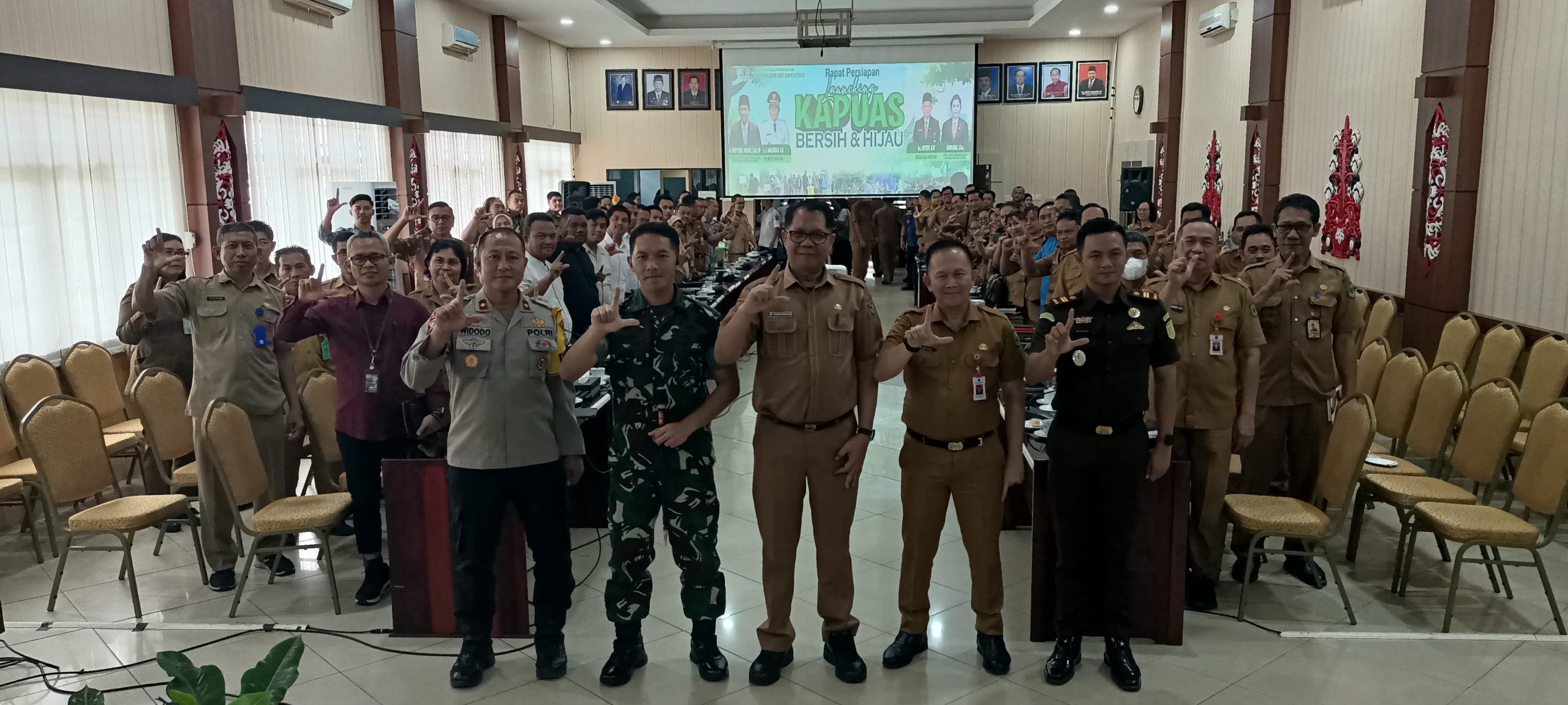 Kapuas-Pemerintah Kabupaten Kapuas rapat persiapan lanuching Kapuas bersih dan hijau melibatkan seluruh stake holder TNI-Polri,instasi,Organisasi Perangkat Daerah(OPD),Perusahaan Besar Swasta(PBS),baik perkebunan dan pertambangan serta tokoh masyarakat.