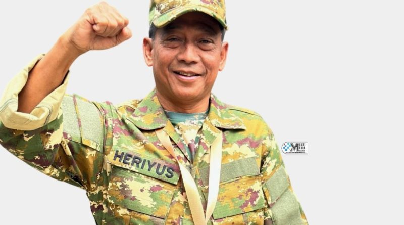 Tampak Bupati Mura, Heriyus mengenakan seragam Komponen Cadangan (Komcad) Tentara Nasional Indonesia (TNI) berwarna loreng hijau, yang terdiri dari topi, baju, celana taktis dan sepatu.