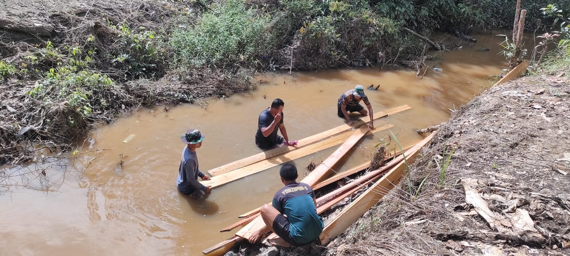 Barito Selatan – Satgas TMMD Kodim 1012/Buntok mengambil cara unik dan kreatif untuk mengangkut kayu menuju lokasi kegiatan TMMD dengan melewati sungai. Meskipun harus berbasah-basahan, kayu yang mengapung di atas air membantu meringankan beban saat pengangkutan.