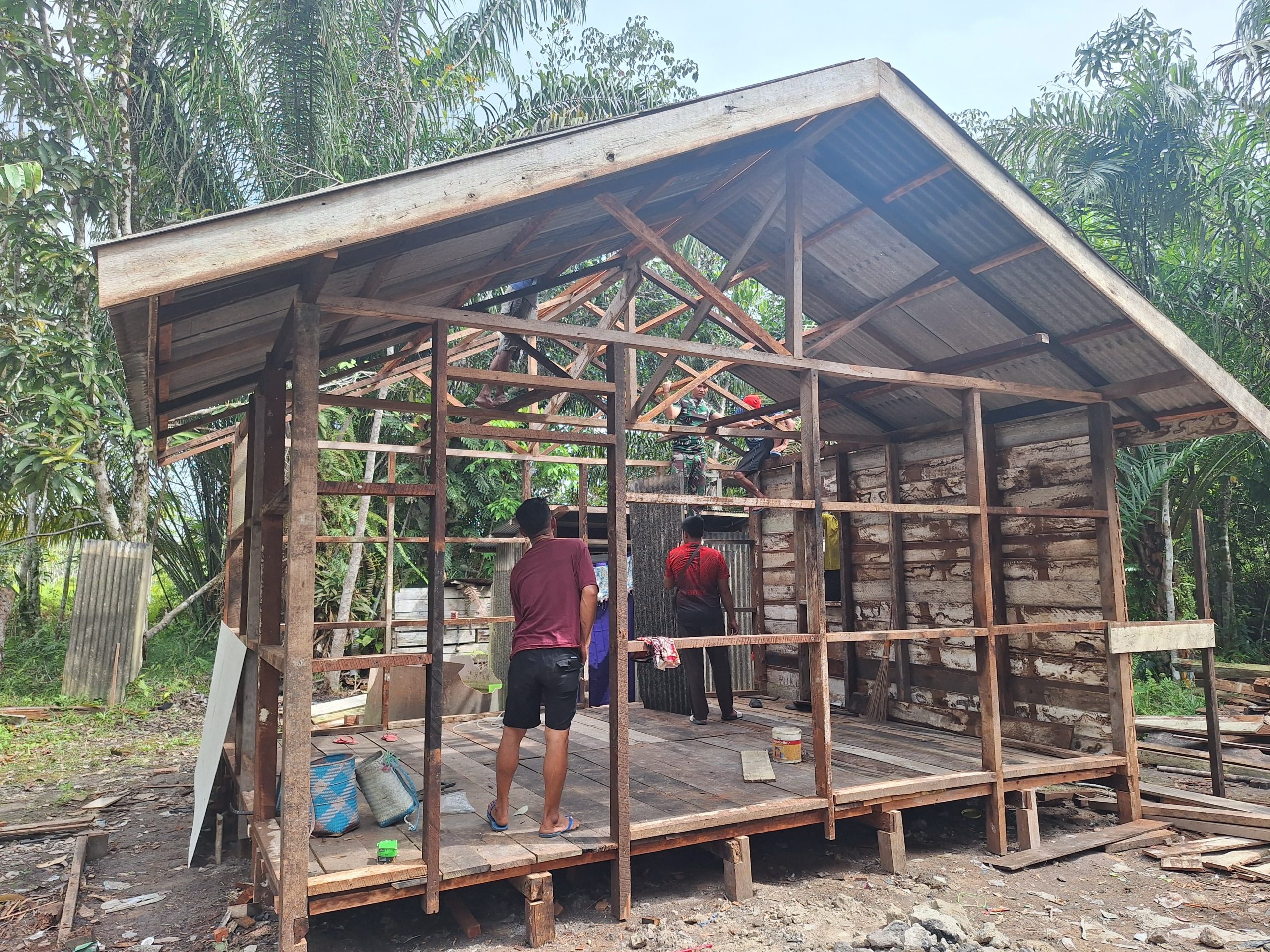 Barito Selatan – Rehabilitasi Rumah Tidak Layak Huni (RTLH) yang merupakan salah satu program TNI Manunggal Membangun Desa (TMMD) Reguler ke-124 Kodim 1012/Buntok, saat ini telah memasuki tahap pemasangan atap, Bertempat di Desa Mungkur Baru, Kecamatan Gunung Bintang Awai, Kabupaten Barito Selatan, Pada hari Kamis (22/05/2025)
