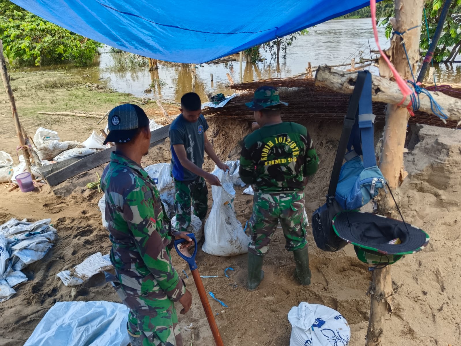 Medan yang sulit ditempuh, membuat Satgas TMMD mencari solusi agar distribusi material tetap berjalan lancar. Dengan penuh semangat, anggota Satgas bersama masyarakat setempat memasukkan sirtu ke dalam karung, lalu membawanya ke lokasi proyek pembangunan jalan