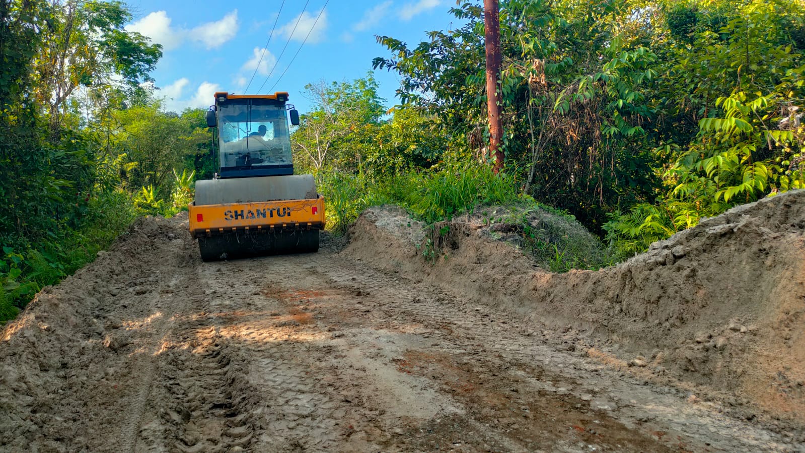Jalan yang sebelumnya berupa tanah liat dan sulit dilalui saat musim hujan kini mulai dikeraskan dengan material pilihan seperti batu pecah dan pasir, yang diratakan menggunakan alat berat dan tenaga manual dari personel TNI serta masyarakat setempat.