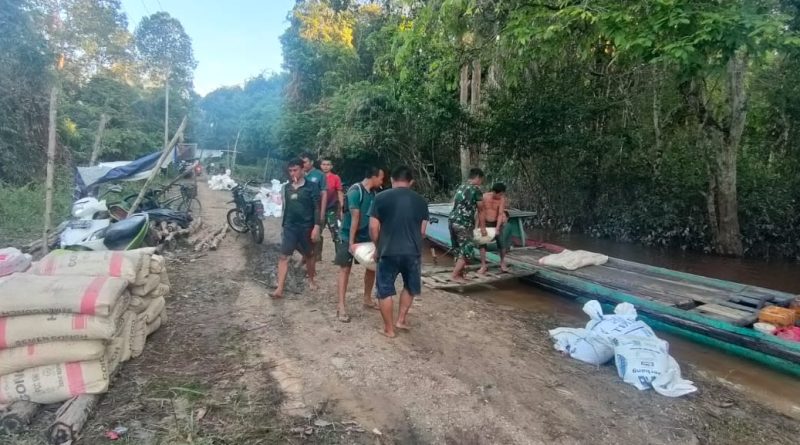 Personel TNI bersama warga bahu-membahu mengangkut puluhan sak semen secara manual menuju titik pengecoran sepanjang ratusan meter. Dengan semangat gotong royong, mereka saling membantu, mulai dari memanggul, menggunakan gerobak, hingga sepeda motor.