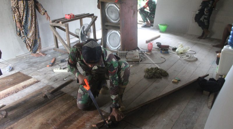 TNI dan Warga Pasang Lantai Rumah Pak Sanggam dalam Program RTLH TMMD di Desa Talio