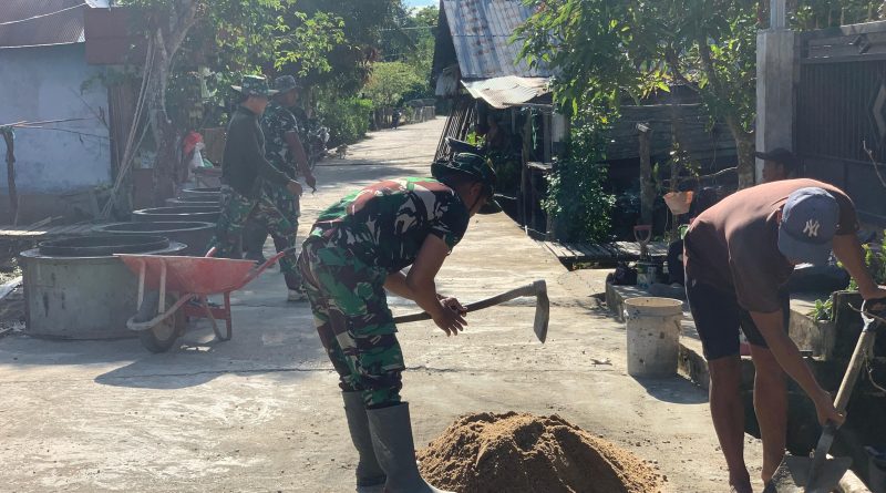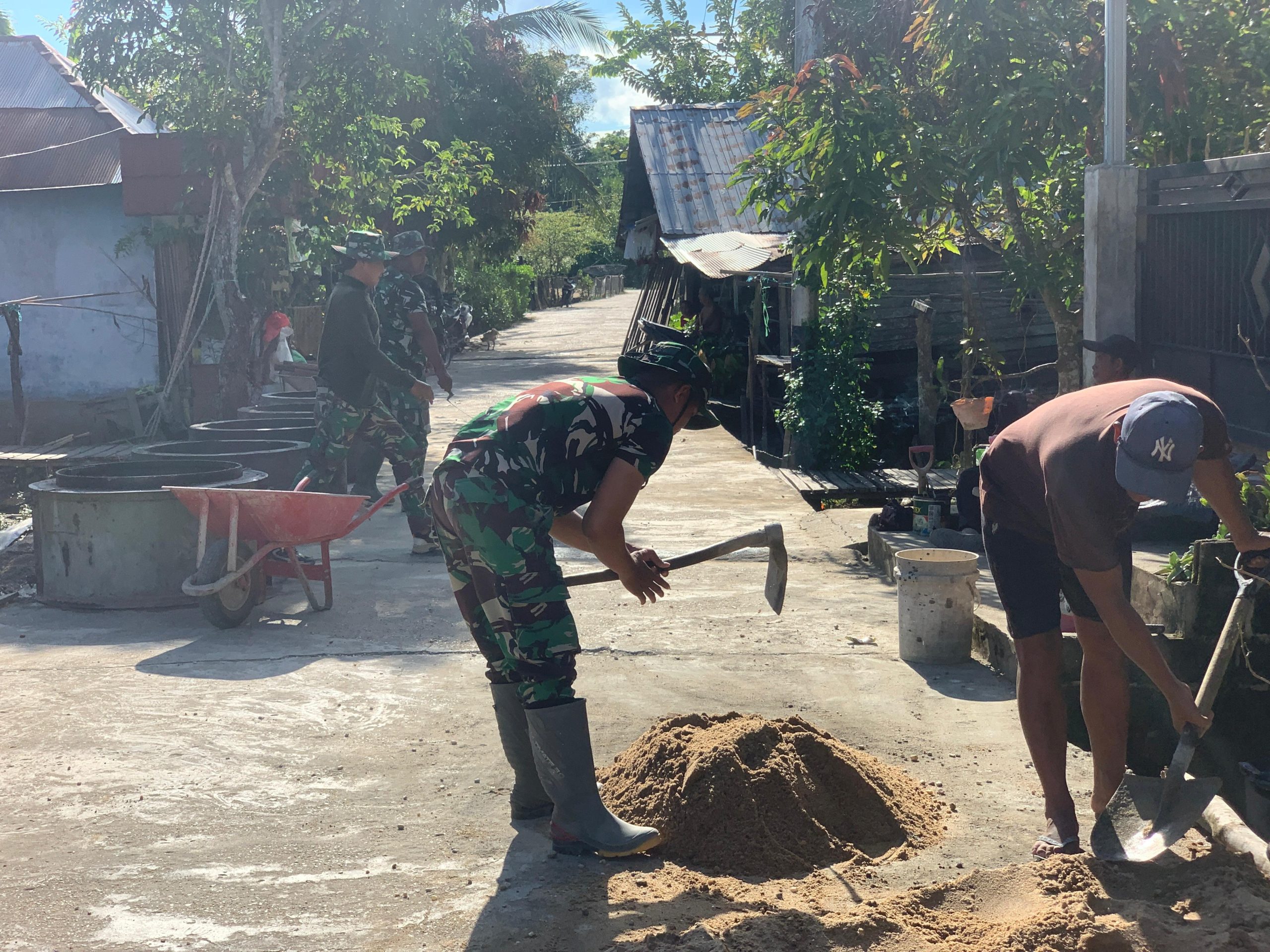 Satgas TMMD Kodim 1012/Buntok Semangat Aduk Semen untuk Pembuatan Sumur Galian di Desa Talio