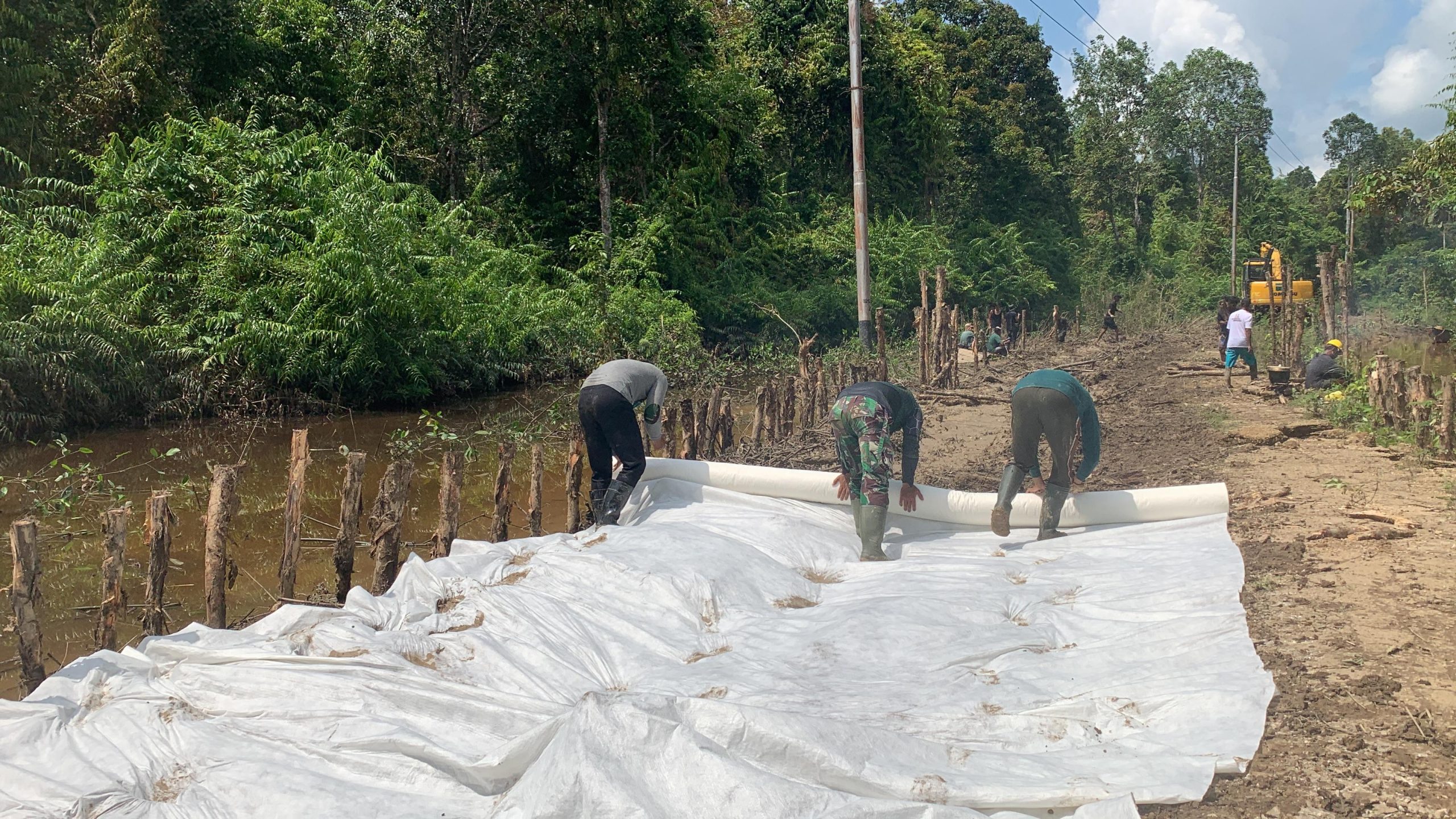 Satgas TMMD bekerja sejak pagi hari bersama warga setempat untuk memasang geotex secara bertahap di sepanjang ruas jalan yang sedang dibuka. Proses dilakukan dengan cermat agar material tidak bergeser dan terpasang rapi di seluruh permukaan yang ditentukan.