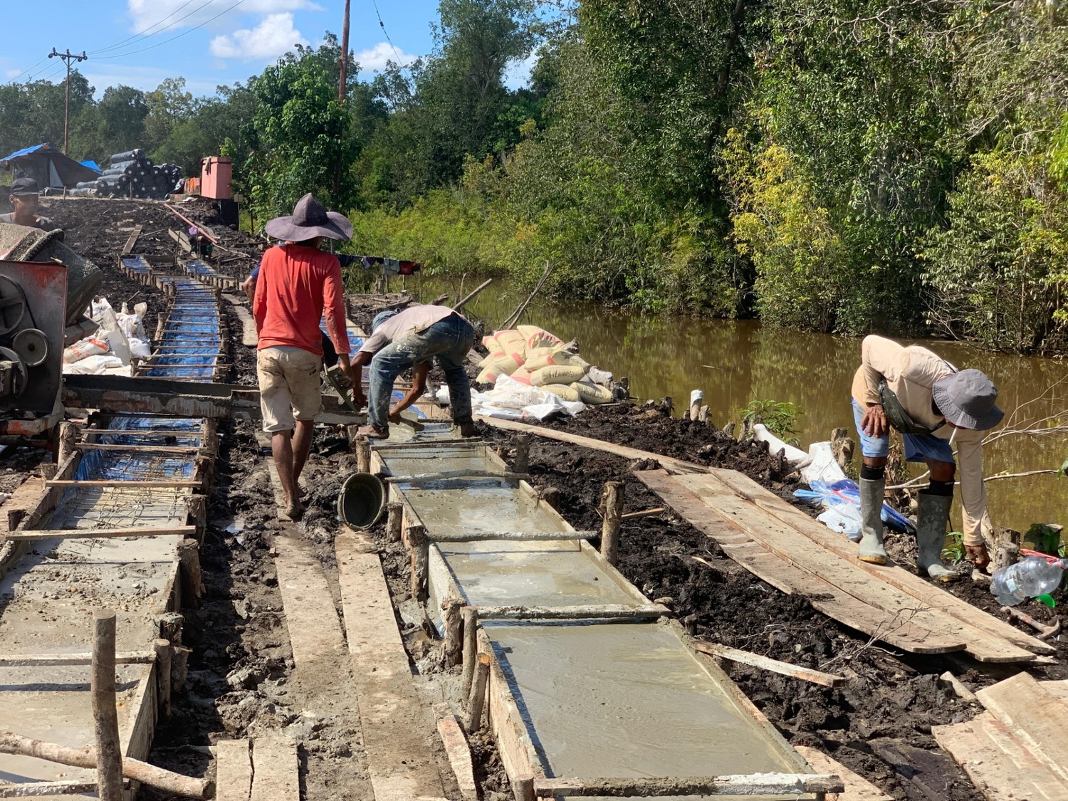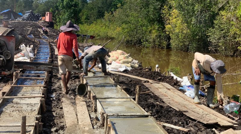 Material seperti semen, pasir, dan batu kerikil diangkut secara bergotong royong dari titik penimbunan menuju lokasi pengecoran. Kerja sama erat ini mempercepat proses pengerjaan jalan yang tengah digenjot agar cepat rampung.